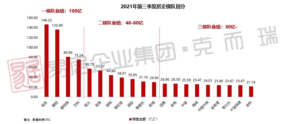 ??房企梯队一梯队业绩100亿左右,俊融、碧万两两竞争;二梯队40-60亿,恒大、龙湖表现稳健;三梯队近30亿,招商、金地等九家房企竞争激烈