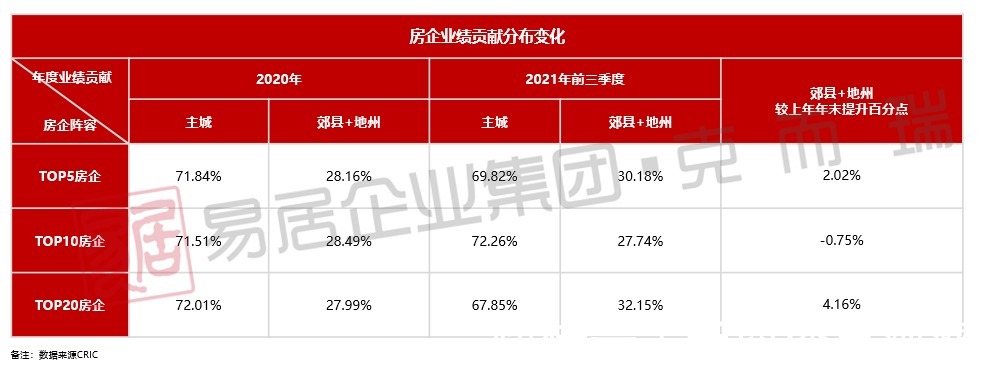??2021年前三季度,TOP20房企主城业绩贡献在上半年结构性提升后再度回落,较去年亦有一定下降。年中业绩冲刺期后,主城成交量价回落,部分项目以价换量,市场观望情绪持续蔓延,房企项目延缓入市,沿湖片区备案停滞;与之相对,地州市场相对稳定,信贷环境无明显收紧,整体业绩贡献近一步提升超去年水平,前20房企中融创、新城的地州+郊县业绩贡献超50%,中梁、海诚、诺士达、金科超70%。