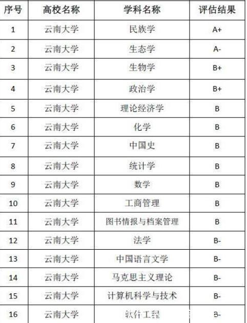 云大是一所综合类的211大学,也是云南最好的大学,省内排名第一。下图是教育部第四轮评估的结果,下图这些学科就是云大的王牌学科: