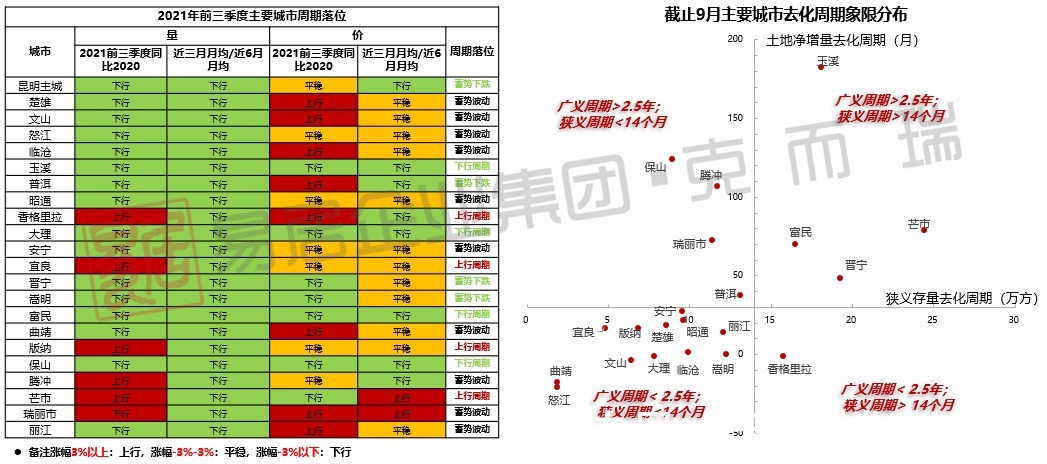 ??行业周期主要城市量以下行为主,价格变化相对平缓。版纳、嵩明、昭通、安宁供需较旺盛,市场相对稳定;玉溪、富民供求失衡,量价具有下探趋势,香格里拉、芒市需求端上扬,蓄势波动;大理、曲靖等风险防范与机会并存