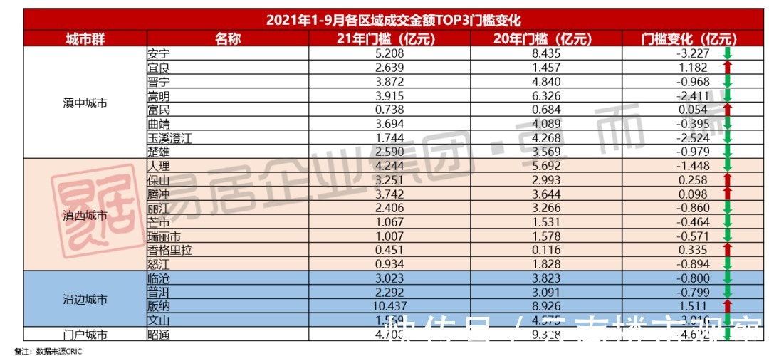 ??整体门槛下滑,版纳、宜良表现亮眼,门槛上涨超1亿元,腾冲、香格里拉等小幅上涨,下滑集中0.40-0.98亿元区间,安宁、文山、昭通降幅超3亿元